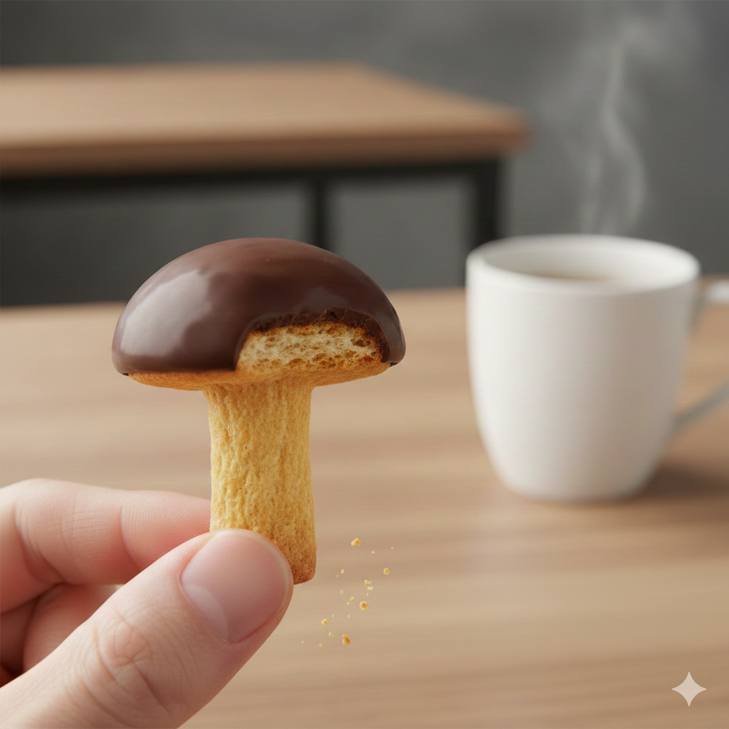 きのこの山の最大の魅力は、あのカリッとした軽やかなビスケットの歯ごたえにあります。ほどよい薄さと硬さを持つビスケットが、たっぷりとのったチョコレートをしっかり支えつつ、サクッと小気味よく砕けていく。そのコントラストこそが、きのこの山ならではの快感です。たけのこの里はクッキーですが、きのこの山はビスケット。軽やかでキレのある食感と、絶妙なチョコとのバランス。この違いこそが、勝敗を分けるのです。
